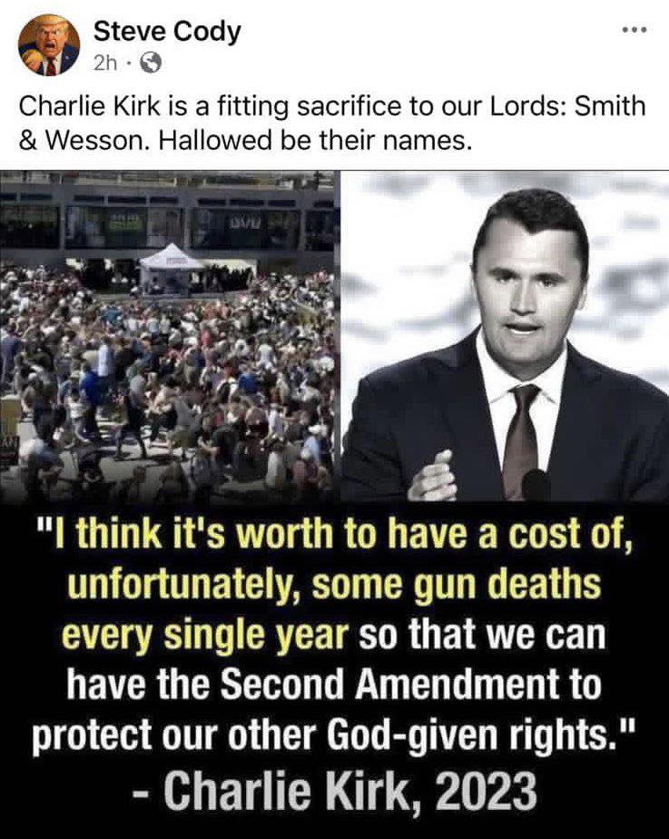 “Florida Democrat Official Steve Cody is a disgrace to public office. After the horrific assassination of Charlie Kirk, Cody chose to sneer, saying ‘Charlie Kirk is a fitting sacrifice to our Lords: Smith and Wesson. Hallowed be their name.’